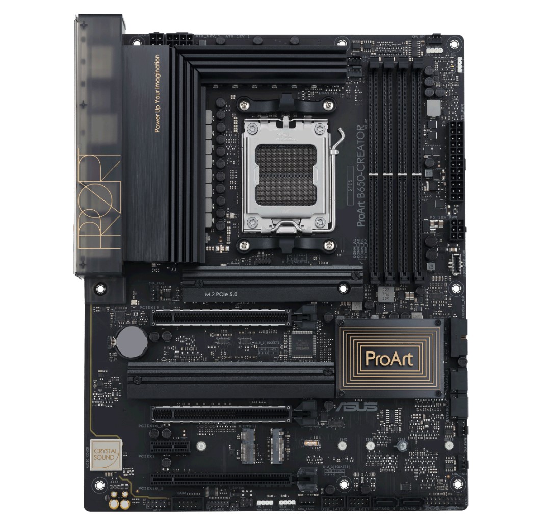ProArt B650-Creator Ryzen AM5 ATX content creation motherboard with PCIe® 5.0 M.2 support, DDR5, 2.5 Gb 1 Gb Ethernet, three M.2 slots, plus USB-C DisplayPort™ and a USB 3.2 Gen 2×2 front panel connector with Quick Charge 4+