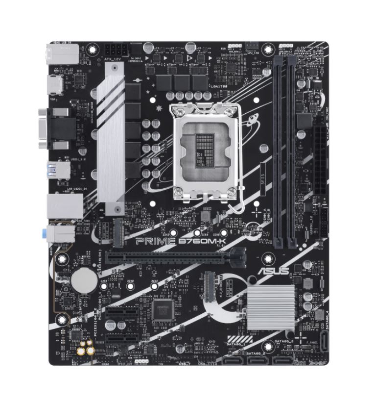 ASUS Prime B760M-K, an Intel® B760 LGA 1700 mATX motherboard with PCIe 4.0, two PCIe 4.0 M.2 slots, DDR5, Realtek 2.5Gb Ethernet, VGA, HDMI™, SATA 6 Gbps, front USB 3.2 Gen 1, Aura Sync