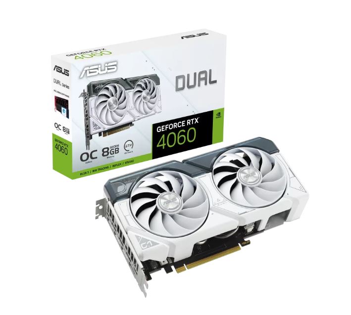 ASUS Dual GeForce RTX™4060 White OC Edition 8GB GDDR6 with two powerful Axial-tech fans and a 2.5-slot design for broad compatibility