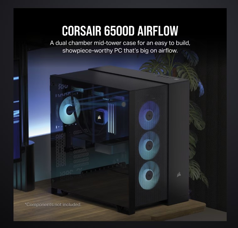 The CORSAIR 6500D AIRFLOW Mid-Tower Dual Chamber PC Case delivers exceptional airflow and cooling with fully mesh paneling and a dual chamber design for an organized, stunning build.